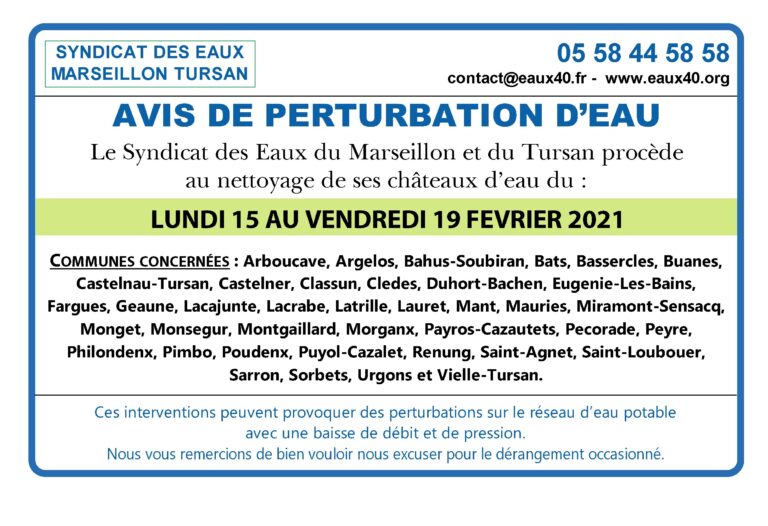 Le Syndicat des Eaux Marseillon Tursan va procéder au nettoyage règlementaire de ses châteaux d’eau du lundi 15 au vendredi 19 février .