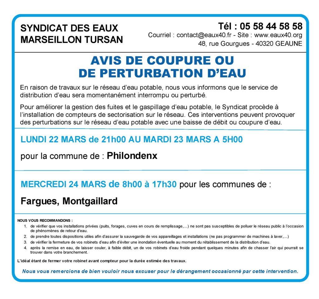 Le Syndicat des Eaux du Marseillon et du Tursan procèdera au nettoyage règlementaire de ses châteaux d’eau du lundi 11 au vendredi 15 mars 2024.