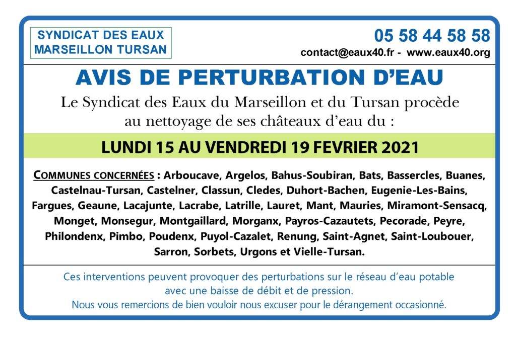 AVIS DE PERTURBATION D’EAU Le Syndicat des Eaux du Marseillon et du Tursan procède au nettoyage règlementaire de ses châteaux […]